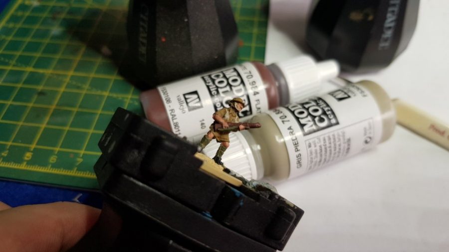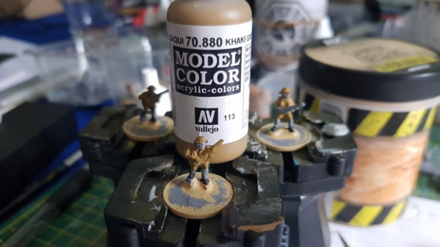 Uniform is now based 70.880 Khaki Grey, then highlighted with 70.847 Dark Sand. No wash is applied.